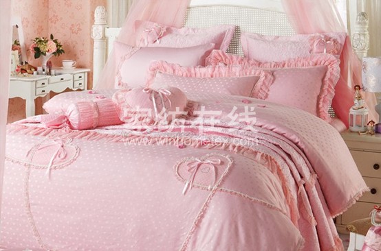 羅萊家紡的此款床品選擇將時(shí)尚可愛的元素加入到床品的設(shè)計(jì)中去,蝴蝶結(jié)與蕾絲的設(shè)計(jì)脫離于表面,更有立體的感覺,可愛大方,獨(dú)特的絎縫技術(shù)編織美好愛情畫面。
