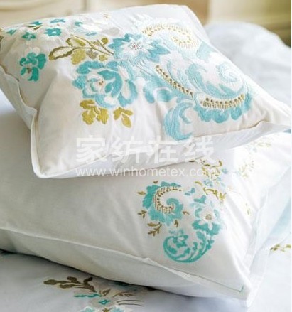 床邊小景:床品選用了有剪紙效果的抽象花紋為主題,清淡的天藍(lán)色和黃綠色相搭配,映襯于棉質(zhì)的白地上,通透而具清爽的感覺。印花與刺繡工藝相結(jié)合,使得圖案具有凹凸起伏的觸感和層次的變化。枕頭或多印花,或多留白,主題在統(tǒng)一中富有變化。