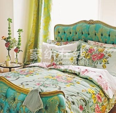 床品細(xì)節(jié):仿真的花草圖案是床品的特色。要實(shí)現(xiàn)繽紛瑰麗的花卉效果,出色的印染工藝是關(guān)鍵。其能表現(xiàn)出多種顏色,多種層次,多種細(xì)節(jié)的花草圖案變化,增添了植物紋理的真實(shí)感。淡綠色的底色也鋪墊出了自然的氛圍。