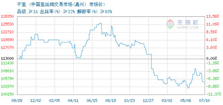 7月10日,干繭(3A以上)參考價(jià)為105425.00元/噸,與7月1日(106750.00)相比,下降了1.24%。