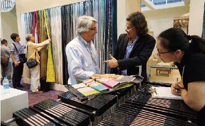 在上海中國國際家紡展上,外商紛紛來到海寧參展企業(yè)的展位上挑選產(chǎn)品。