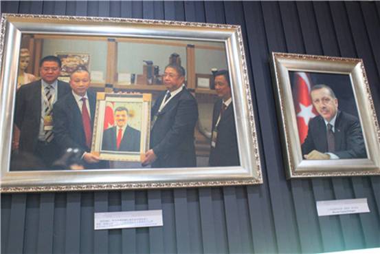 絲立方董事長盧云華向中國駐土耳其大使展示贈送土耳其總統(tǒng)及總理的真絲畫像