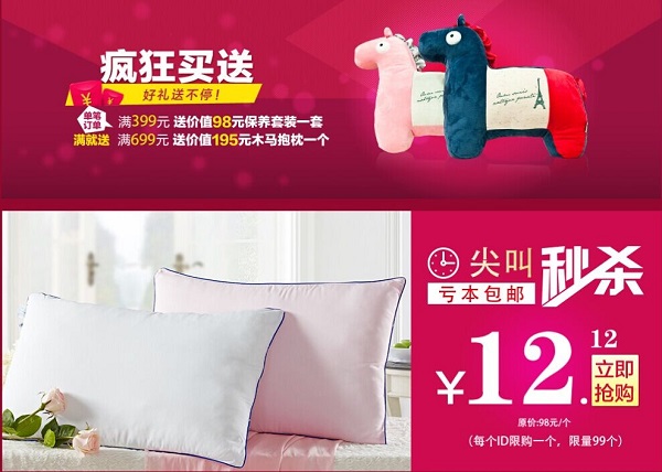 淘寶開啟12.12萬能盛典活動,并將延續(xù)“全民瘋搶”的活動!坝晏m”今年最后一次大型促銷,2014天貓雙十二品牌盛典活動,不只是五折,千萬禮券免費領,更有虧本包郵產(chǎn)品尖叫秒殺;消費者只需在12月10日—12月12日,支付滿399即送價值98元保養(yǎng)套裝一套、滿699即送價值195元木馬抱枕一個,另有幸運大轉盤讓您嗨到停不下來。更多詳情請登陸雨蘭天貓旗艦店:http://yourland.tmall.com。12月12日,給臥室來點彩色,讓這個冬天不再寒冷。