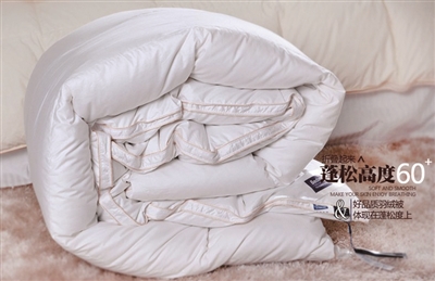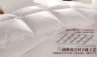 這兩年,羽絨被開始走俏市場,成了冬季居家必備的行頭,但是消費(fèi)者對于羽絨被的相關(guān)常識卻知之甚少。到底羽絨被比起普通的被子好在哪里?使用羽絨被又該如何保養(yǎng)?“絨也分品種,我們羽絨系列產(chǎn)品選用的絨都取自于東北羽絨黃金產(chǎn)地散養(yǎng)的鴨和鵝腹部,一般來說,北方的鴨、鵝生長期比南方長,絨朵也相對較大,最重要的是經(jīng)歷了全年193天漫長冬季、70℃絕對溫差,北方絨達(dá)到了最優(yōu)的保暖性能。羽絨被以輕柔、蓬松著稱,我們生產(chǎn)的羽絨系列產(chǎn)品,按照羽絨特性科學(xué)配比填充,產(chǎn)品靜止空氣達(dá)到最合理的比例,從而使羽絨被保暖性能達(dá)到人體最舒適的程度!