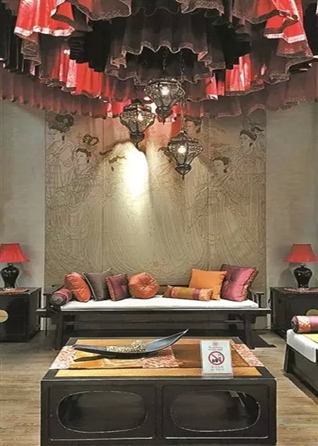 以唐代著名道教白描《八十七神仙眷》為題材,巨大的布藝墻飾采用金線細(xì)細(xì)描繪,衣袖飄飄,仙氣拂面,成為空間中絕對(duì)的主角。