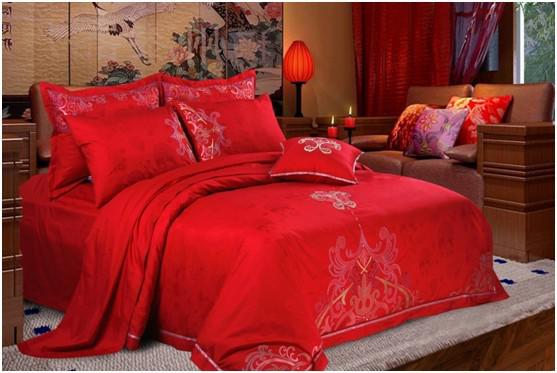 本款運(yùn)用大提花面料,色澤璀璨,質(zhì)感華貴,玫瑰花型大氣飽滿,層次豐富,色彩搭配和諧雅致,將花朵的嬌艷完美詮釋。枕頭精致的繡花元素是設(shè)計(jì)的點(diǎn)睛之筆,時(shí)尚、浪漫、高貴,體現(xiàn)出一種低調(diào)的奢華。金色繡線繡著圓形雙喜,飽含著“團(tuán)團(tuán)圓圓”的美好祝福和“喜事連連”幸福含意,處處充滿喜慶之感。