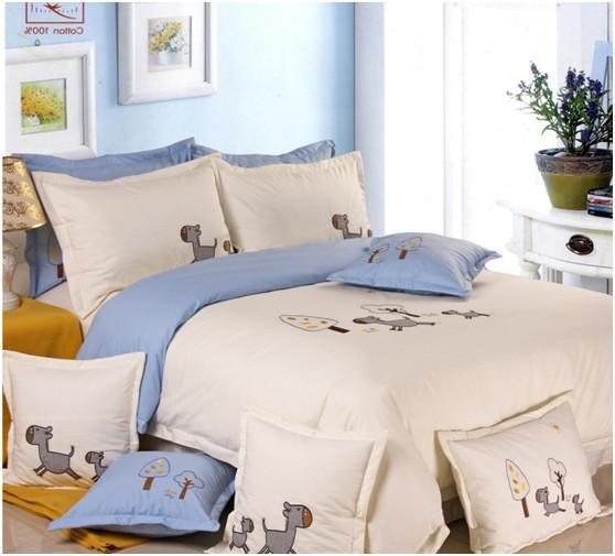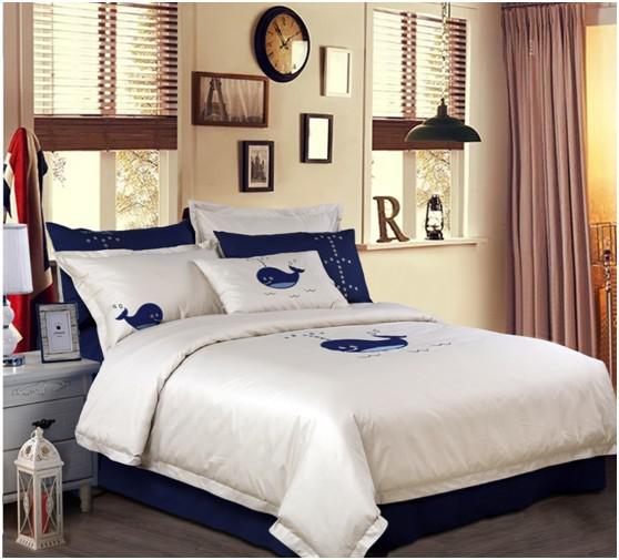 深藍(lán)色的床單像深邃的大海,米白色像大海上潔白的浪花,小鯨魚(yú)采用貼布繡工藝,形象立體如生,風(fēng)格別致大方。藍(lán)天白云、椰林樹(shù)影、水清沙白,延綿的海岸線上,有一群快樂(lè)的沖浪少年與小鯨魚(yú)共同在浪花中跳躍,他們忘卻煩惱,體驗(yàn)一次次與海浪搏擊、馳騁在海浪上的快感,追逐著最美的海浪。