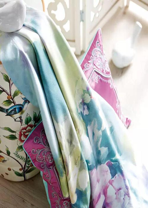 受到中國(guó)藝術(shù)的影響,用中國(guó)畫的手法融入現(xiàn)代的創(chuàng)作方式描繪出極具氣質(zhì)的牡丹等花卉,卷草舒花,纏綿盤曲,連成一體。使得畫面變得優(yōu)美而又神秘。再配以灑脫又不失精致的歐式建筑紋樣,東方藝術(shù)與西方古典的碰撞,極富美感,清新優(yōu)雅,使人耳目一新,配合天絲這種親膚的面料特質(zhì),帶給我們清涼又舒適的睡眠感受,多彩柔和的色調(diào)為炎熱的夏天帶來(lái)一抹靚麗。這款產(chǎn)品是對(duì)花朵及其顏色色彩美輪美奐的運(yùn)用,特別是色彩所展現(xiàn)出生機(jī)盎然的春天的景象,面料光澤柔亮,手感舒適柔軟絲滑,適合有品位的都市人群。