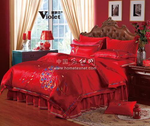 被套、枕套采用繡花工藝,他他米和包針,其中穿插金銀繡線。床蓋歐枕絎縫,童枕,靠墊繡花。被套上孔雀嘴部的鉆飾可脫卸,可做胸針使用。兩個(gè)枕套的繡花拼湊在一起形成一個(gè)愛心,表示心心相印,真愛天成。這是一款時(shí)尚婚慶產(chǎn)品,適合時(shí)尚年輕的新人使用。