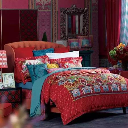 典雅墨綠、神秘的藍(lán)色與喜慶的紅色相交織,豐滿的色彩大面積鋪陳,節(jié)奏感和層次的色彩搭配。光澤的緞面面料,營(yíng)造濃烈的吉祥喜慶之感,高品質(zhì)的婚慶床品,輕松打造一個(gè)完美的婚房。
