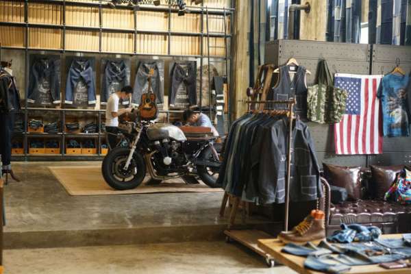 DESSO的定制門店即坐落在博洋集團內(nèi),由一幢老建筑重新裝修而成,一樓為體驗中心和版房,二樓為辦公室。王明偉特意從廣東等地收集了多臺幾十年歷史的定制機器,還放置了兩臺重型機車,這讓門店看上去是現(xiàn)代牛仔與復古工藝的結(jié)合體,讓很多人慕名前來。