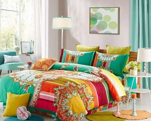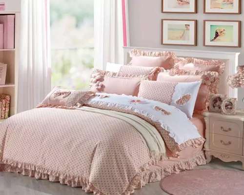 清新的橘粉色加上可愛的小花朵底紋,簡潔文雅,溫馨甜蜜。被面的小精靈拋灑著幸運(yùn)四葉草,給人們帶來幸運(yùn)和美夢成真的夢想。蝴蝶結(jié)帶來的淑女情結(jié)與枕面上立體的花朵相呼應(yīng),帶來青春的氣息。