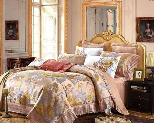 法式香檳色為主色調(diào),桑蠶絲經(jīng)緯紗交織出繁花似錦的紋樣,高檔蕾絲的樹葉花邊點(diǎn)綴其間,整幅畫面猶如午后慵懶的陽光。