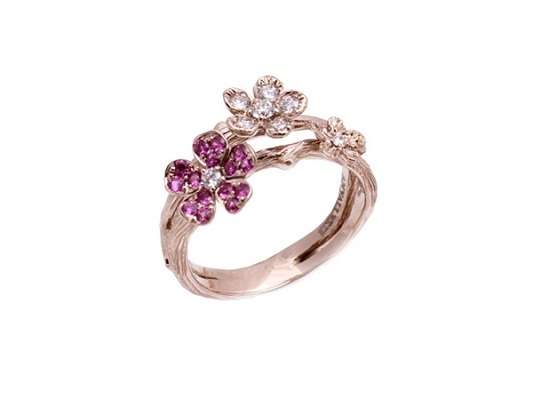 櫻花系列耳環(huán)、戒指及吊墜全部以綴上三朵櫻花的樹枝為設(shè)計(jì)藍(lán)本,采用18K白金或玫瑰金。花瓣位置則鑲有珍貴的粉紅寶、紅寶、白鉆及綠鉆。此系列首飾適合日常佩戴,喜歡大自然及獨(dú)特花卉設(shè)計(jì)的女士定必一見傾心。