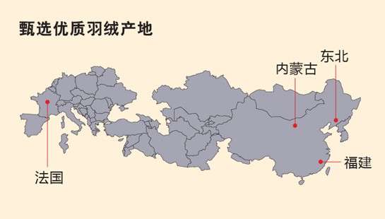 據(jù)了解,芮卡羽絨主要來自世界羽絨的優(yōu)質(zhì)產(chǎn)地:內(nèi)蒙古、法國、中國東北。這三地冬天氣候冰冷,羽絨保暖性極佳,蓬松度極高。