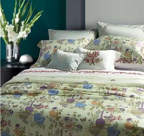寢品花型取材自西方瓷器,將瓷器上的圖案設(shè)計(jì)復(fù)刻于面料之上。細(xì)致花卉圖案的勾畫,呈現(xiàn)出朵朵奇姿異彩的花朵,各種大小不一的葉子與花朵緊密連接,繁復(fù)細(xì)膩的花朵布滿整個(gè)空間,藤蔓和葉脈的穿插交錯(cuò),仿佛飄出屢屢襲人的清香,那花如浪,那香如風(fēng),仿佛走進(jìn)花的海洋。