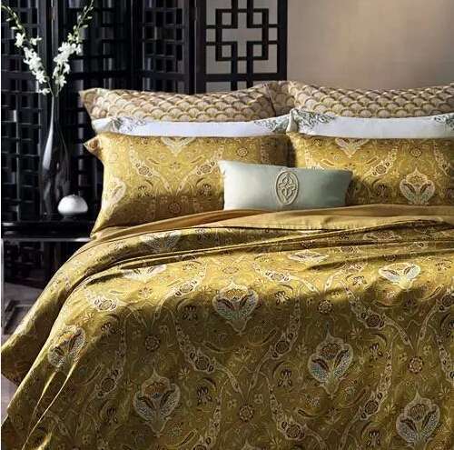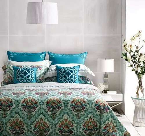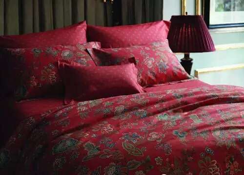 面料選用全棉重磅裝飾面料,三經(jīng)三緯的織法,這種特殊織法使布面呈現(xiàn)十字繡的肌理,有厚重感。結(jié)合異域風(fēng)情的古典東方圖案為寢品增添了神秘而濃郁的色彩。花型古典帶著簡約,圖案化的表現(xiàn)方式更加現(xiàn)代輕松,花朵的大塊面表現(xiàn)之中填了絲絲的肌理效果,增添了一分細(xì)節(jié)之美。色彩鮮亮跳躍,給新古典風(fēng)格加入新鮮感。