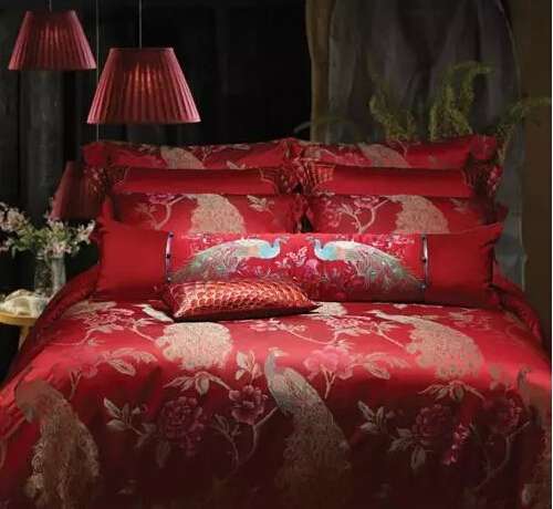 “孔雀眠高閣,櫻桃拂短檐”孔雀是善良、華貴、吉祥與幸福的象征。寢品以孔雀和牡丹為主題?兹冈跂|方,寓意夫妻恩愛,白頭偕老,對愛情忠貞不渝。牡丹被譽(yù)為花中之王。牡丹雍容大度,花開富貴,是吉祥富貴的象征。款式搭配上頗具匠心的融入了錦緞宮廷繡花長枕,長枕有著長長久久寓意和美的含義,長枕的色彩也是突破傳統(tǒng),在紅色上運(yùn)用綠松石的藍(lán)色點(diǎn)綴,用盤扣平添細(xì)節(jié)之美。