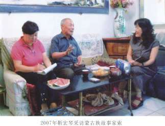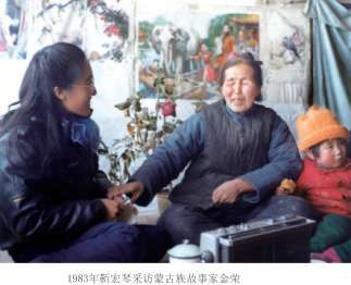 這一年的夏末秋初,靳宏琴在敖木倫河西岸桃花池尋訪到了寶音和都達古勒老夫婦。秋末,在白塔子鄉(xiāng)三道營子采訪的途中,遇上了一位蒙古族老阿嬤叫金榮,她說她的故事“讓你用車拉都拉不動”。于是,靳宏琴背著錄音機,沿著敖木倫河岸,交替地對寶音和都達古勒、金榮三位故事家進行采錄,間或還要尋訪其他故事傳承人。冬去春來,靳宏琴有時住在金榮老阿嬤家,有時住在寶音、都達古勒老阿爸老阿嬤家。有時幫他們做家務(wù),有時幫他們收莊稼。他們親切地稱她呼恨,她更把他們當(dāng)成親阿爸親阿嬤。他們?yōu)樗v述故事時,把童年的快樂講給她,把婚姻和家庭的苦辣酸甜講給她,把對人生對世態(tài)的感懷講給她。金榮老阿嬤不止一次淚眼汪汪地對她說:“呼恨(姑娘)啊,阿嬤第一眼看見你的時侯,就把你認成了我的親呼恨,阿嬤埋在肚子里的話全倒給了你,心里再也不憋屈了。做夢都夢不著,阿嬤老了老了認識了你,多了一個說心嗑的人,天意呀!”