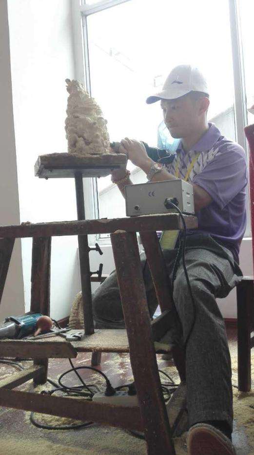 圖為黃建海參加現(xiàn)場雕刻技藝大賽留影