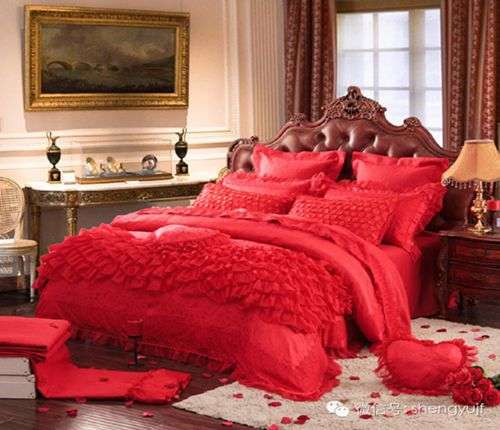 喜慶的中國紅采用磨毛面料,時尚簡約的豹紋設計,采用褶皺充棉的花邊設計,立體感強,別致新穎,床單下擺處花邊的層層使用增添了嫵媚靚麗的氣氛,小抱枕采用貼布繡工藝繡上七彩的龍鳳圖騰,寓意龍鳳呈祥,搭配的仿水貂床巾繡花色彩豐富吉祥,可搭配使用也可作為日常裝飾。