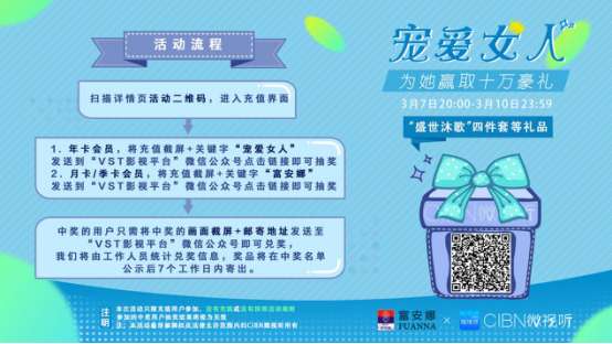 3月7日20:00至3月10日24:00,凡在微視聽充值年會員、季會員、月會員的用戶憑購買截圖參與抽獎活動,即有機會贏取一套富安娜提供的價值近3000元的“盛世沐歌”高檔四件套。無論是獻殷勤表愛意的男士、犒勞自己的女士,還是借機向母親表達謝意的孝順兒女,都能借此機會送出一份既能表達心意又獨一無二的禮物,讓她們享受“舒舒服服躺在床上看電視”的寵愛。