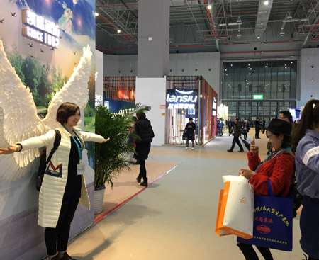 凱盛家紡的展館,以新穎的創(chuàng)意,高端的設(shè)計(jì)與布置,吸引了來訪者的眼球。近300平方米的展廳以歐式風(fēng)格為主,以白、藍(lán)、紫為基色調(diào)。展館外形,情景化打造出優(yōu)雅醒目的一對(duì)白翅膀,在山腳下準(zhǔn)備飛入山頂,帶你體驗(yàn)云端輕松舒適的感覺!帮w上云端“的概念也成為眾人的焦點(diǎn),來賓紛紛與之合影,成為展會(huì)當(dāng)天的”人氣網(wǎng)紅“。
