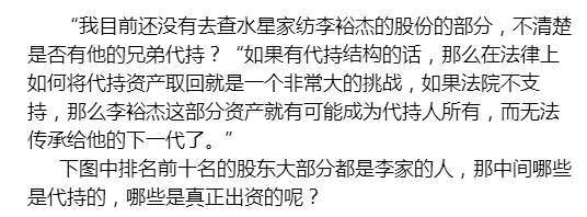 郭升璽表示,水星控股集團(tuán)有限公司持有公司53.90%的股份,而李裕杰持有水星控股集團(tuán)有限公司35.87%股份。同時,李裕杰個人還直接持有水星家紡9.24%的股份。由此可見,如果沒有事先安排好繼承計劃,李裕杰個人持有的股份及資產(chǎn),都將納入法定繼承的范圍內(nèi)。依照中華人民共和國的繼承法第十條,法定繼承就是按一定順序。第一順序,是配偶子女還有父母,第二順序就包含在兄弟姐妹祖父母和外祖父母。現(xiàn)在這個時候,假如李裕杰之前沒有做任何身后的安排,也沒有做遺囑的話,就不用講其他的法律結(jié)構(gòu)了,他這些資產(chǎn)自然地就會落到法定繼承。