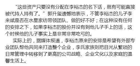 李裕杰的突發(fā)去世,不禁讓人開始擔(dān)心水星家紡這個家族企業(yè)的傳承問題?李家是否已經(jīng)早早就安排了繼任者?他的資產(chǎn)是否會被瓜分?