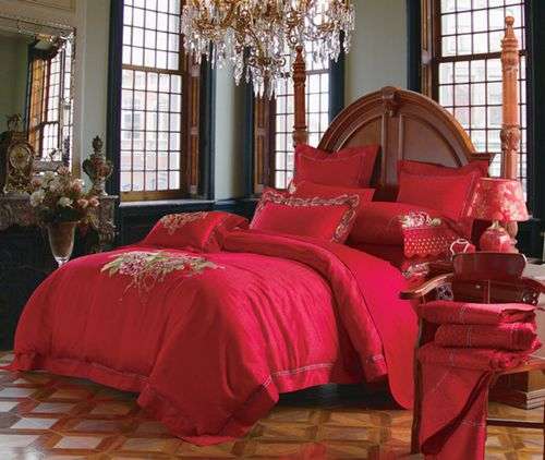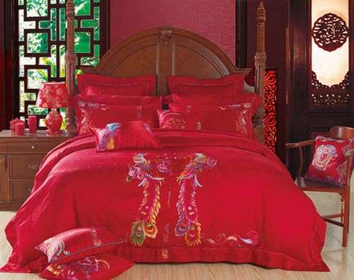 多彩繡的牡丹圖案色彩艷而不俗,層次豐富,雍容華貴,皇冠和珠寶串成的瓔珞更是富貴和吉祥的象征。大紅的提花面料濃重?zé)崃,充滿喜慶的感覺?钍截S富精致,百萬針數(shù)的繡工,美麗的彩鉆恰到好處的裝點(diǎn),一切讓整套產(chǎn)品光彩奪目,富貴豪華。適合中西合璧,傳統(tǒng)和現(xiàn)代并存的裝修風(fēng)格,是婚慶家居的理想選擇。