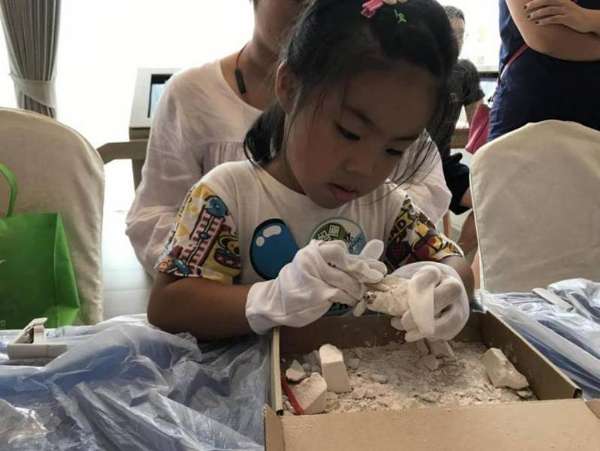 這一環(huán)節(jié)讓孩子們在學習知識的同時,酣暢淋漓地玩了一把!戴上手套挖化石,自己動手DIY恐龍——小朋友們忙地熱火朝天。活動進行過程中,龍城中央的銷售中心回蕩著孩子們的歡聲笑語,熱鬧非凡。