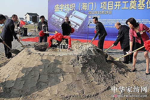 10月29日上午8點58分,盛宇家紡集團江蘇新特家紡有限公司工程奠基儀式在江蘇海門舉行。江蘇海門市市長楊曹明,市委副書記、市委常委陸一飛在工程奠基儀式上講了話。海門市相關(guān)部門領(lǐng)導也參加了工程開工奠基儀式。盛宇集團黨委書記、副總裁、盛宇家紡集團江蘇新特家紡有限公司總經(jīng)理曾上潮遠赴江蘇海門,出席了工程開工典禮儀式并講了話。盛宇家紡集團江蘇新特家紡有限公司建設(shè)項目,位于江蘇省海門市工業(yè)園區(qū)紡都大道南側(cè),占地面積47.9畝,總投資2億元,計劃2013年10月開工建設(shè),2014年9月竣工投產(chǎn),投產(chǎn)后預計年可生產(chǎn)家用紡織品200萬套套件,預計年銷售收入超5億元,可實現(xiàn)利稅4000萬元。