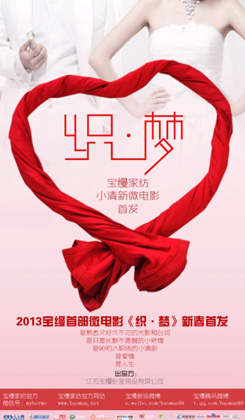 在家紡行業(yè)競(jìng)爭(zhēng)日趨激烈的今天,家紡企業(yè)的品牌化競(jìng)爭(zhēng)之路走得更為嚴(yán)峻了,而微電影對(duì)于家紡企業(yè)來(lái)說(shuō)完全是為企業(yè)品牌推廣量身定做的影視宣傳。至此,家紡企業(yè)的品牌推廣開始進(jìn)入微電影時(shí)代,并將“微”特點(diǎn)發(fā)揮到了極致。