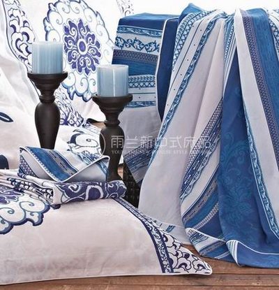 “韻染青瓷”床蓋六件套的設(shè)計,A版仿絲棉大提花印花采用大版平網(wǎng)的工藝,龍紋提花結(jié)合通透似玲瓏的底紋,體現(xiàn)出了玲瓏剔透、幽靜雅致、精巧細膩、樸素大方的藝術(shù)特色,B版的藍色調(diào)全棉活性印花給人以清新明快之感,枕面配以獨有的花型,使整套產(chǎn)品以一個青花瓷的藝術(shù)形式展現(xiàn)出來。