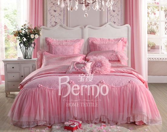 玉粉色的靈動(dòng)小花與蕾絲的完美結(jié)合,將柔美浪漫淋漓精致的體現(xiàn)。這個(gè)設(shè)計(jì)靈感來(lái)源于新娘的甜美婚紗裙擺,床的裙紗采用弧線形式,更添唯美浪漫之感。