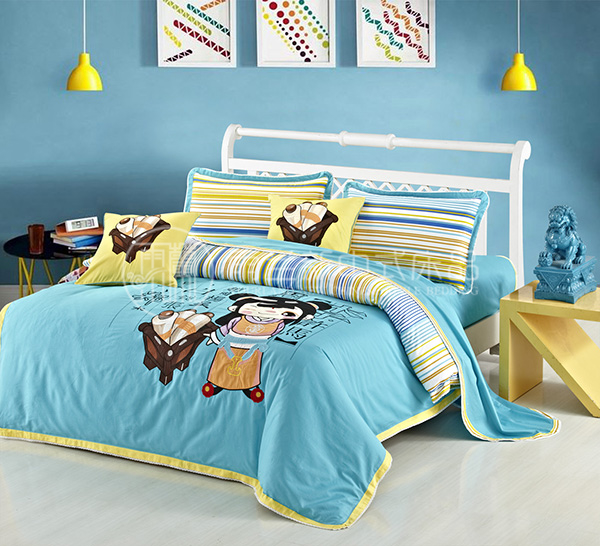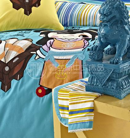 雨蘭新中式床品國學(xué)系列“百家姓”,以淺藍(lán)為主色調(diào),床單三/四件套的組合方式,全棉印花面料,使用獨(dú)特的貼布繡手法在被面繡上可愛的孩童與書桶。當(dāng)然,少不了我們的主題“百家姓”,被面三周拼黃色鏡框邊,被底為彩色條紋,橙、紅、黃、藍(lán)、紫,整體的色彩搭配鮮艷但又透著清新,吸引孩童的眼球,激發(fā)他們的求知欲。