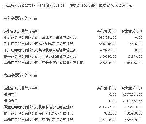 - 資訊周二,多喜愛(002761)迎來復(fù)牌之后的第三個漲停板,股價高開之后維系高位震蕩,午后封板直至收盤,報36.38元,成交額為4.45億元,環(huán)比進(jìn)一步放量。值得關(guān)注的是,昨日有兩個機(jī)構(gòu)專用席位大額賣出。龍虎榜數(shù)據(jù)顯示,昨日賣出金額前兩名均為機(jī)構(gòu)專用席位,賣出金額分別為4557.28萬元和2271.77萬元,第三名是國金證券(600109)北京長椿街營業(yè)部席位,...