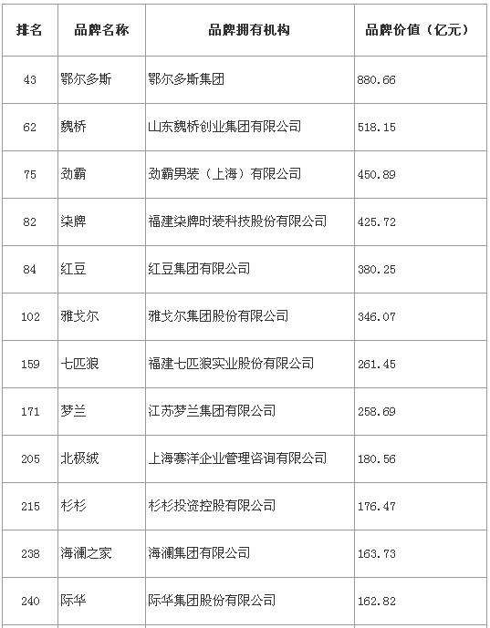 - 資訊近日,由世界品牌實(shí)驗(yàn)室組織評(píng)選的2017“中國500最具價(jià)值品牌”榜單在北京揭曉。自2004年首屆發(fā)布“中國500最具價(jià)值品牌”榜單至今,世界品牌實(shí)驗(yàn)室編制中國品牌報(bào)告已經(jīng)有14年,相比首屆,2017年“中國500最具價(jià)值品牌”榜的品牌總價(jià)值、平均價(jià)值、入選門檻都有了非常大的增長。而在25個(gè)相關(guān)行業(yè)當(dāng)中,紡織服裝行業(yè)以29個(gè)入榜品牌,在行業(yè)分布前10名中位居...