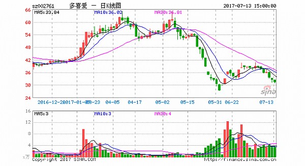 - 資訊熱點欄目資金流向千股千評個股診斷最新評級模擬交易客戶端新浪財經(jīng)App:直播上線博主一對一指導(dǎo)6月1日晚間,多喜愛(002761.SZ)公告控股股東陳軍、黃婭妮質(zhì)押的部分股份觸及警戒線,股票自2017年6月2日開市起停牌,預(yù)計停牌時間不超過10個交易日。這家公司的股價在最近9個交易日已經(jīng)接近腰斬。如此大幅度下跌,部分原因可能要歸于一個合作對象。上個月,多喜愛公...