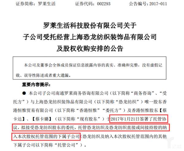- 資訊2017年1月23日晚間,羅萊生活發(fā)布公告稱,宣布以股權(quán)托管及未來并購(gòu)的形式與老牌知名家紡企業(yè)上海恐龍紡織裝飾品有限公司開展全面合作。不難看出,羅萊生活正在其優(yōu)勢(shì)領(lǐng)域和戰(zhàn)略領(lǐng)域做新布局。據(jù)了解,上?铸埣徔椦b飾品有限公司成立于2005年,由蔡卡璐、蔡卡達(dá)兄弟在上海創(chuàng)立,在一線城市的高端商業(yè)渠道有較強(qiáng)話語(yǔ)權(quán)的家紡品牌,門店數(shù)量近300家。同時(shí),恐龍紡織作為Es...
