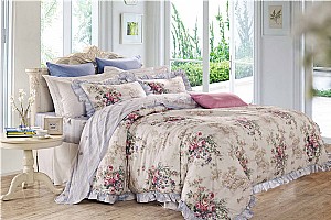比薩花園:面料采用精品滌棉,色澤自然,親膚又貼身,面料透氣舒爽。壓邊的褶皺設(shè)計(jì)甜美有可愛,邊部褶皺面料和主面料使用不同的兩種顏色,增加了床品的層次感。淡紫色與米白色的搭配簡潔明快,花型采用粉紅色的玫瑰花搭配淺墨綠色的枝葉,突出了多元結(jié)合的風(fēng)格,時(shí)尚、浪漫、高貴,體現(xiàn)出一種低調(diào)的奢華。