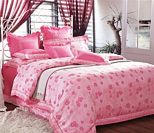 紫晶戀曲--淡雅的粉紫色調(diào)最是女人最愛的浪漫情懷,設(shè)計師將紫色作為創(chuàng)意靈感的延伸點,選用天絲粘膠提花面料,將色彩應(yīng)用的思考植入織紋,再配以花型圖案,以朦朧的創(chuàng)意概念加入其中,使整體感覺柔和搭調(diào)。工藝的安排以電腦花車貼紗縫繡,透過紗線的導(dǎo)光效果,將柔和的感覺再次延伸。枕套與床單的電腦波浪剪邊工藝,讓造型凸顯俏麗。